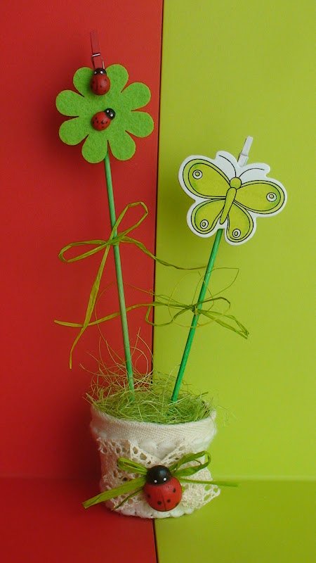 Также в работе использованы х/б кружево, киперная лента, тесьма, рафия, декоративные украшения: божьи коровки, фетровый цветок, деревянная бабочка, прищепки.