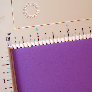 Проводим линии биговки по делениям: 1 1/2" 1 3/4" 3 3/4" 4" (см. на фото ниже).Должно получиться вот так: